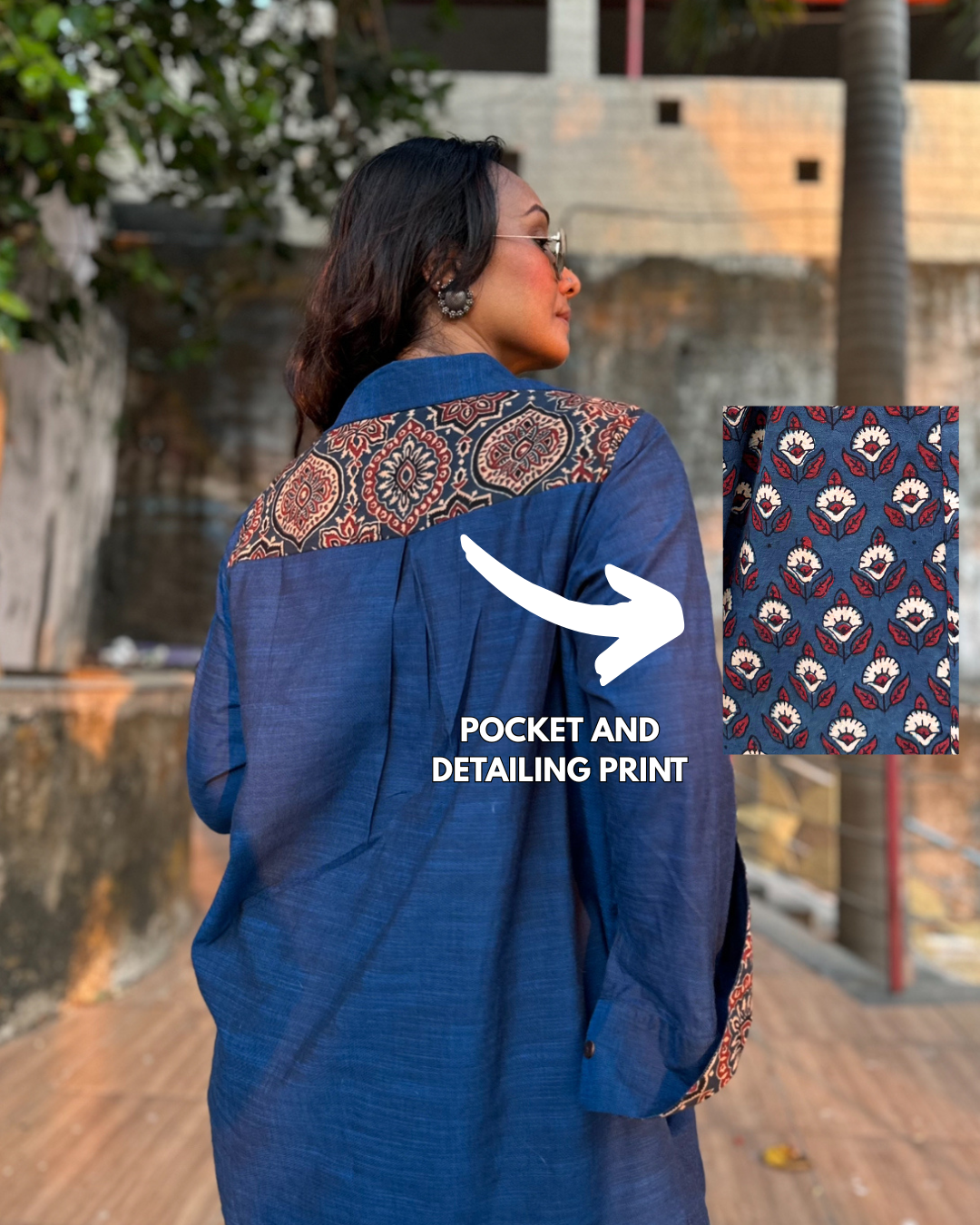 The Summer Edit, this anti-fit shirt and shorts set blends comfort and style effortlessly. The Ajrakh contrast detailing on the back panel and sleeve cuffs adds a touch of handcrafted charm. Whether worn as a set or styled separately, this breezy cotton ensemble is a must-have for easygoing summer days.