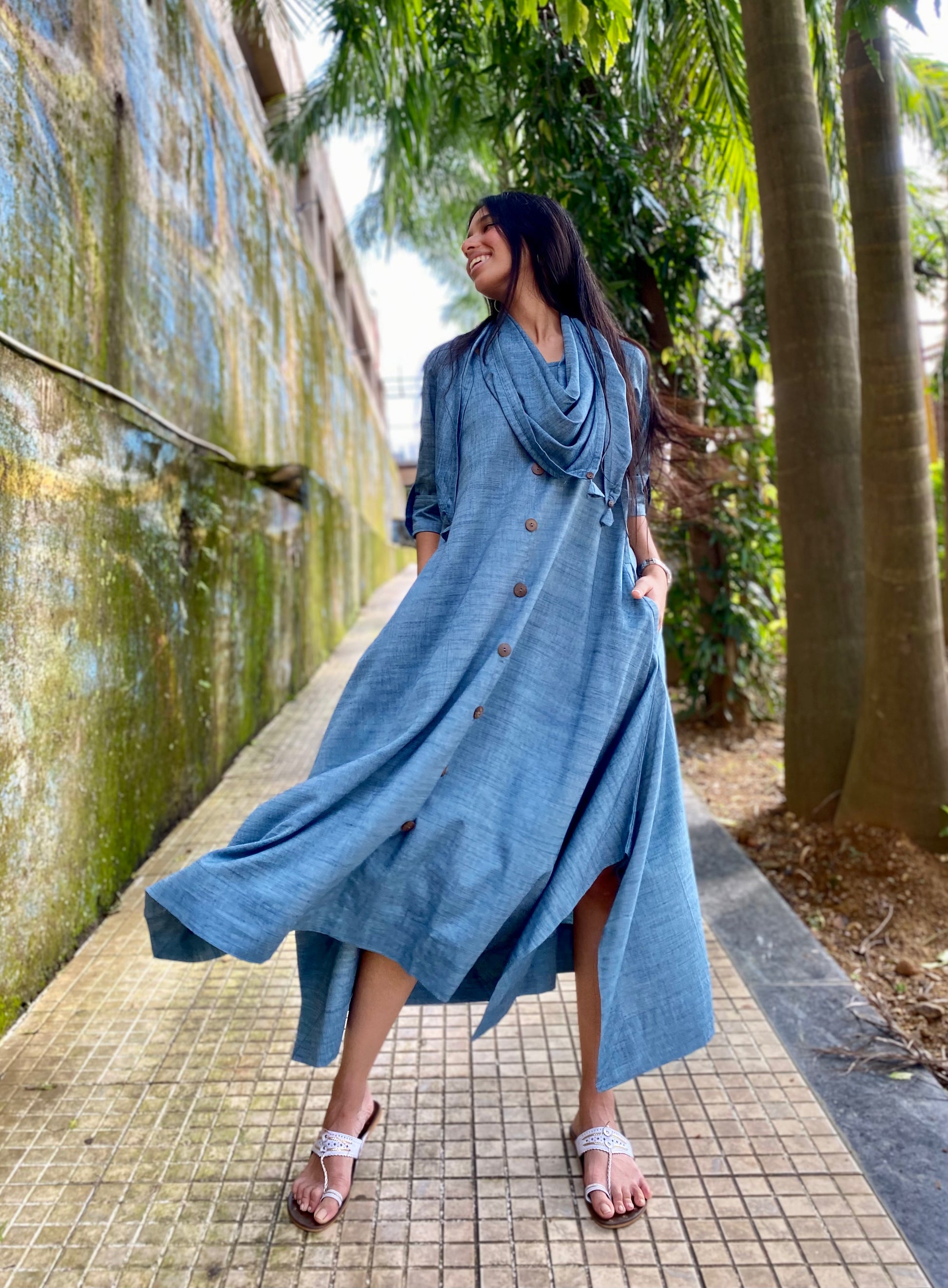 A timeless asymmetrical dress featuring double slits and functional pockets on both sides. Crafted in classic solid shades from soft cotton, it offers a second-skin feel with a relaxed, anti-fit silhouette. The front button detailing adds warmth and understated elegance.