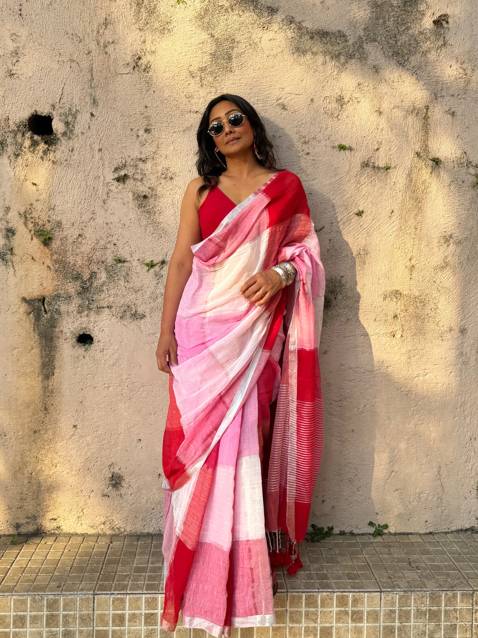 Sarees crafted in a breathable linen–cotton blend, designed to be lightweight, comfortable, and easy to wear. Open and airy weave.
