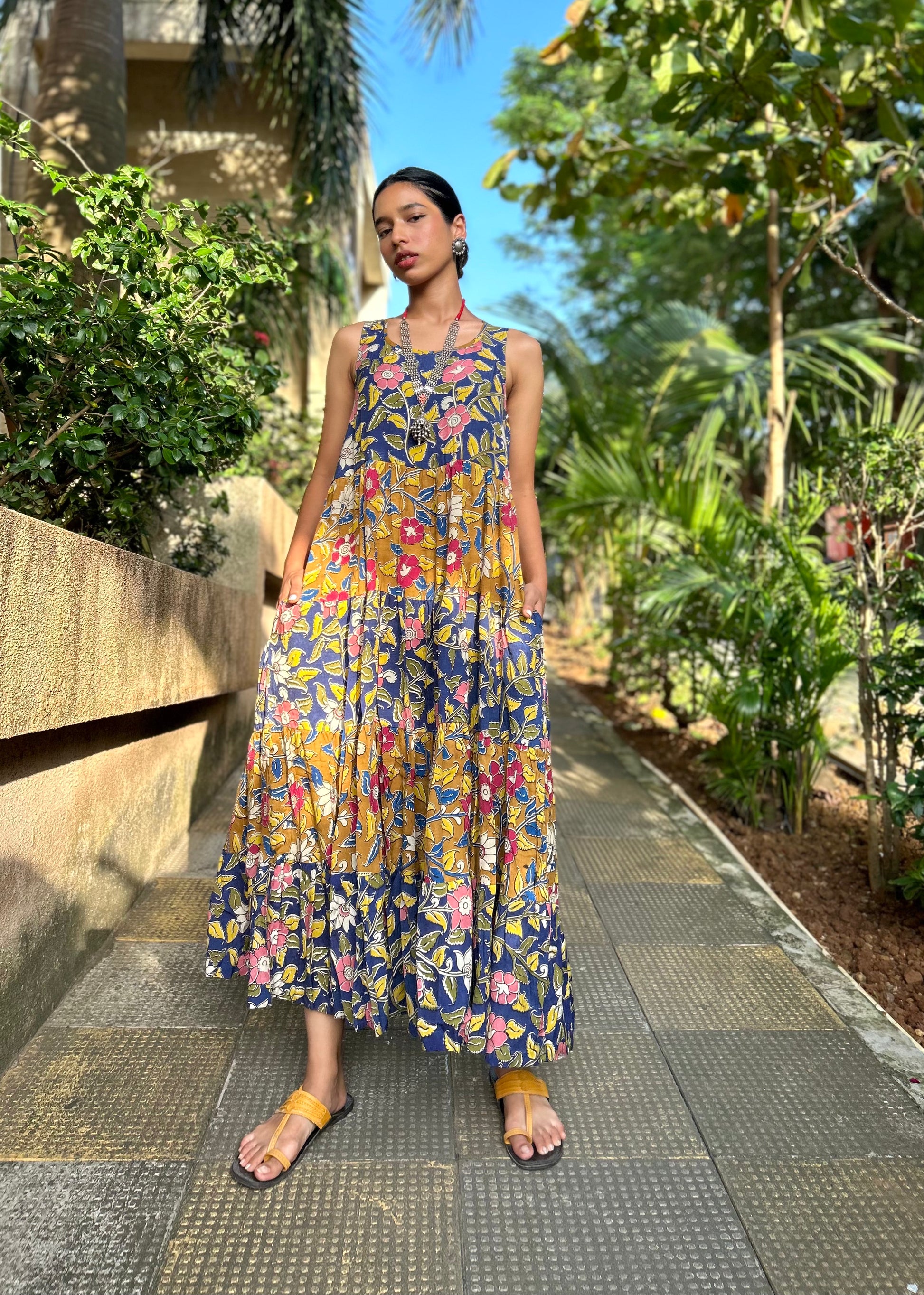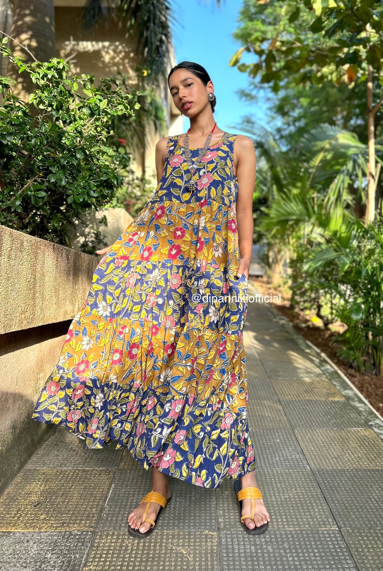 A breezy, effortless silhouette crafted from the softest, buttery cotton silk with handcrafted pen Kalamkari detailing. Designed for all-day comfort, this five-tiered beauty is a true head-turner. Whether styled casually or semi-formally, its versatility makes it a timeless addition to your wardrobe.