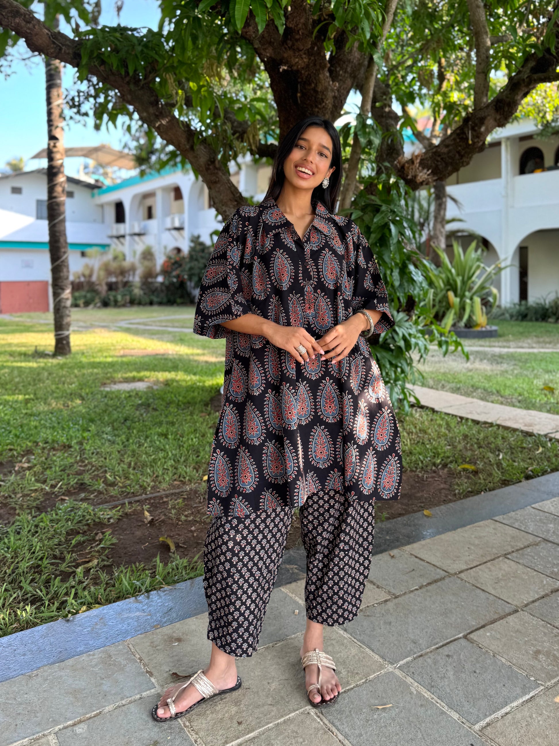 Thoughtfully designed in hand block-printed Ajrakh cotton, the Ārdrā co-ord set blends traditional artistry with everyday comfort. Naturally dyed and crafted by skilled artisans, each piece features a relaxed, anti-fit silhouette that moves with you. The comfort fit kurta with pockets easy, Afghani pants make it ideal for warm days, travel, or quiet moments at home. Effortless to wear, timeless to keep.