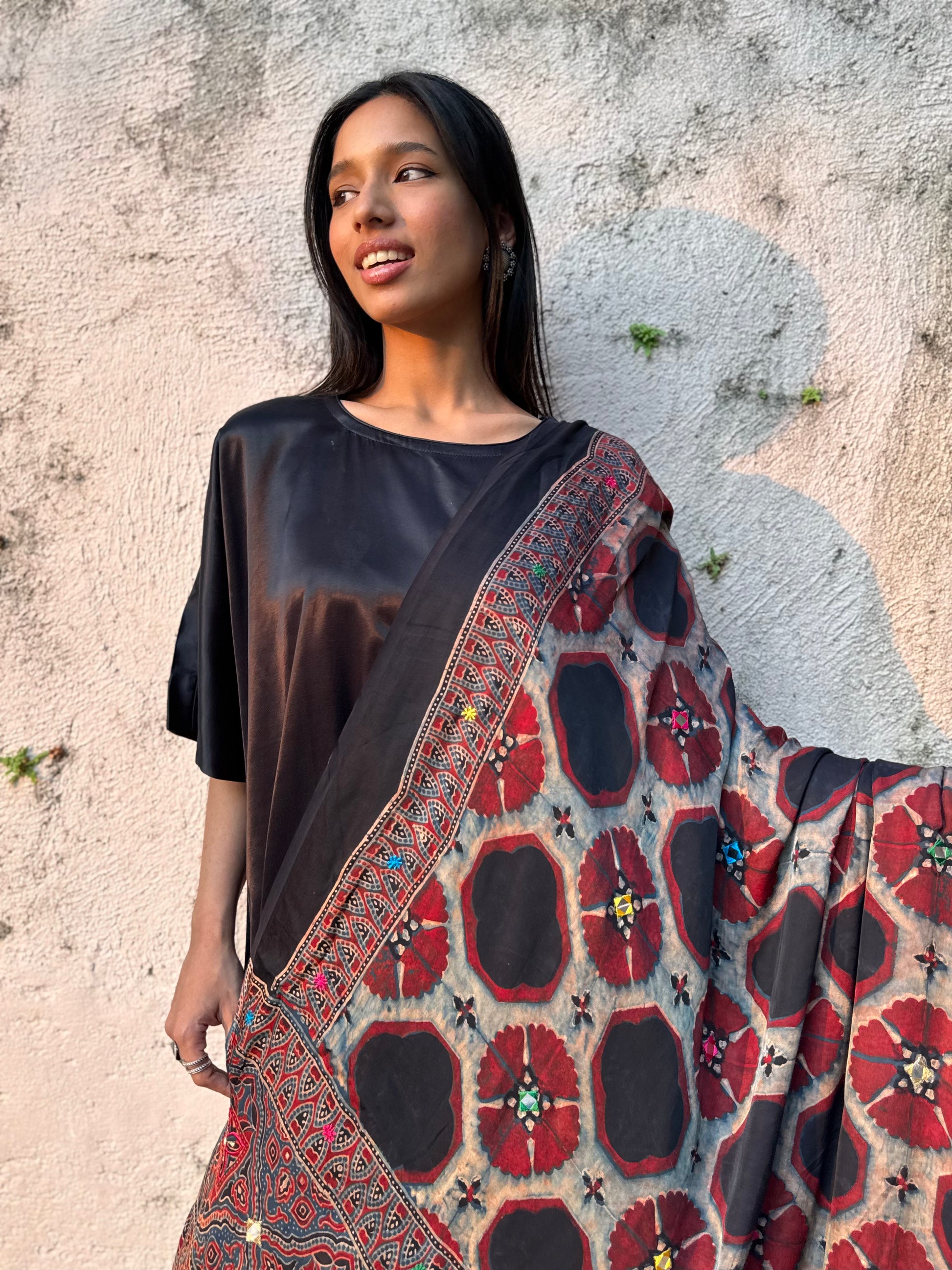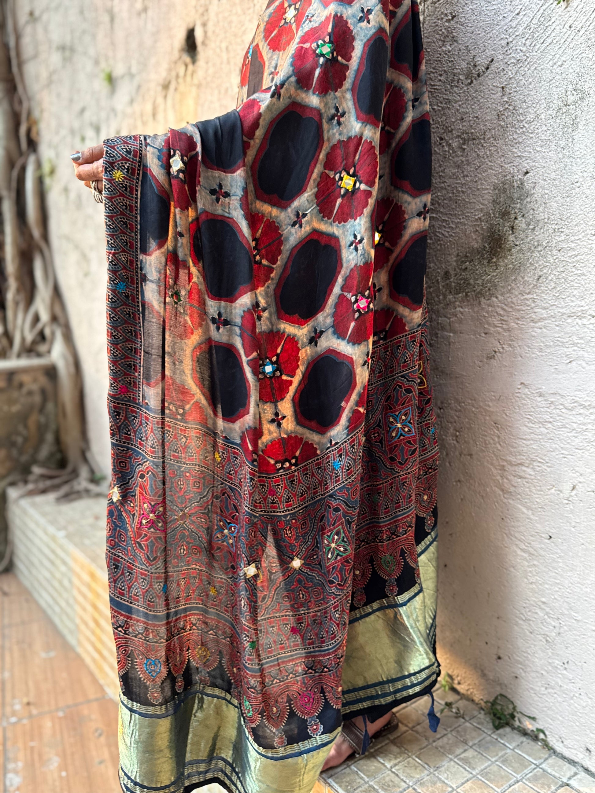 A festive edit of hand block-printed modal silk dupattas, where fluid drapes meet delicate mirror-inspired embroidery, thoughtfully brought to life by our skilled karigars.
