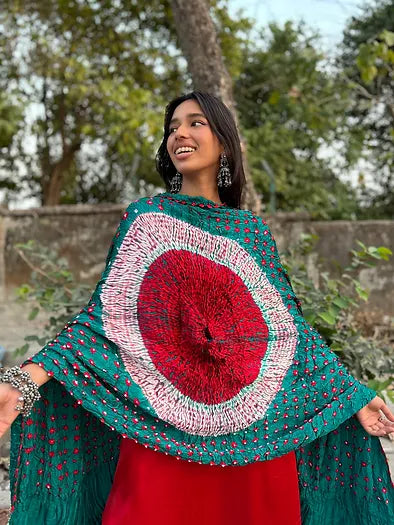 Step 4: take the rest of the chadar and bring it around and tuck it in the centre as shown