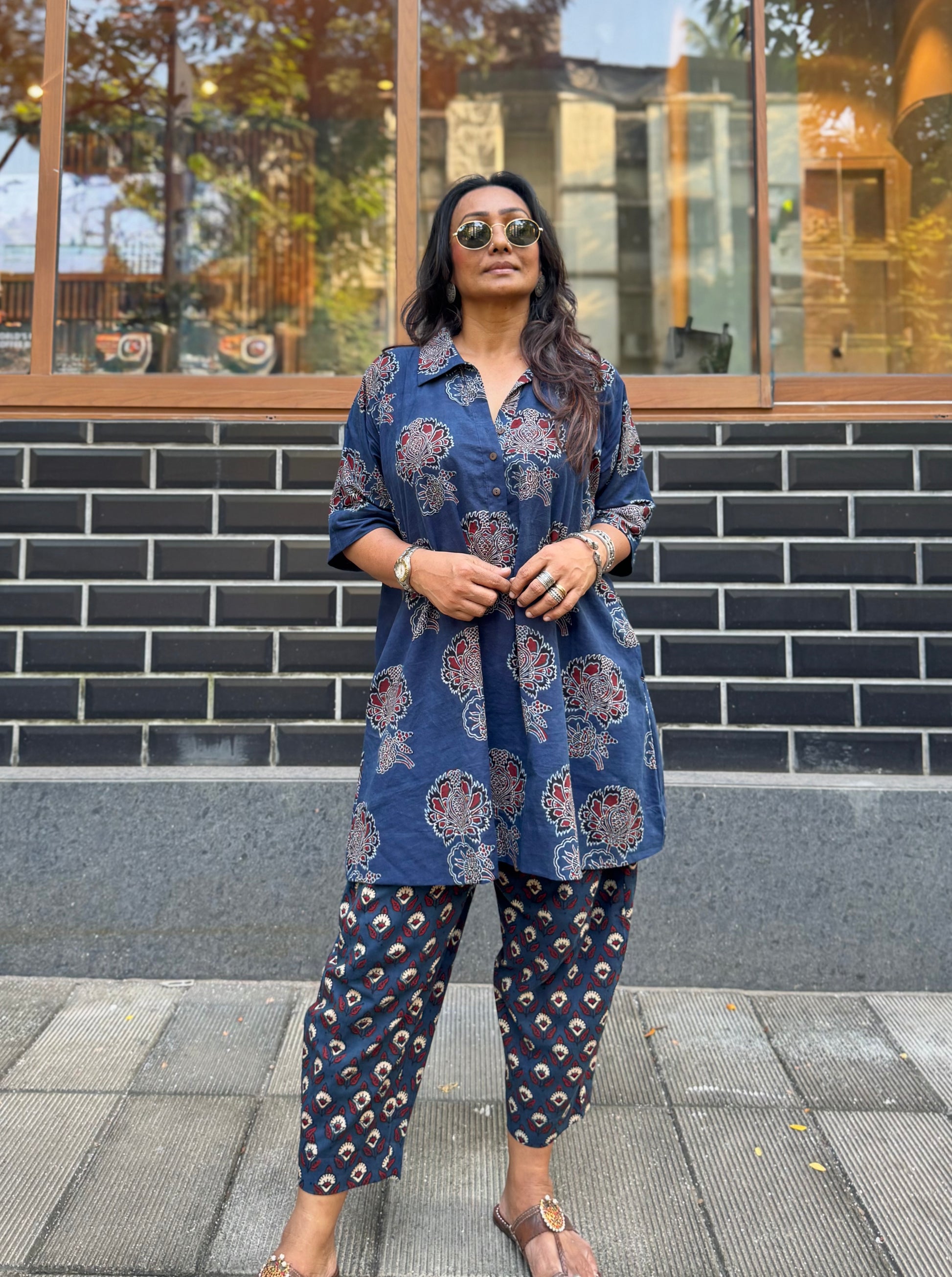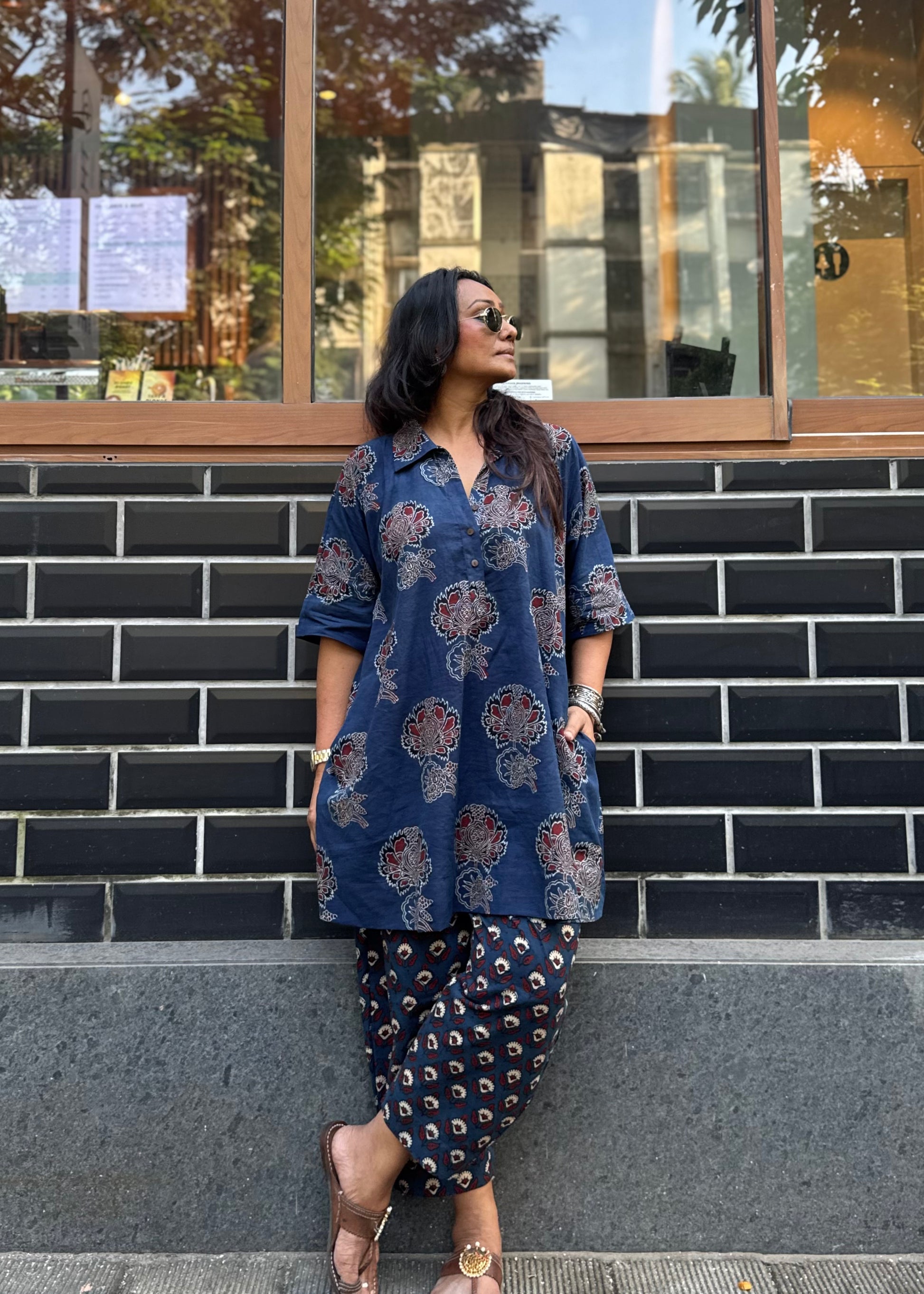 Thoughtfully designed in hand block-printed Ajrakh cotton, the Ārdrā co-ord set blends traditional artistry with everyday comfort. Naturally dyed and crafted by skilled artisans, each piece features a relaxed, anti-fit silhouette that moves with you. The comfort fit kurta with pockets easy, Afghani pants make it ideal for warm days, travel, or quiet moments at home. Effortless to wear, timeless to keep.